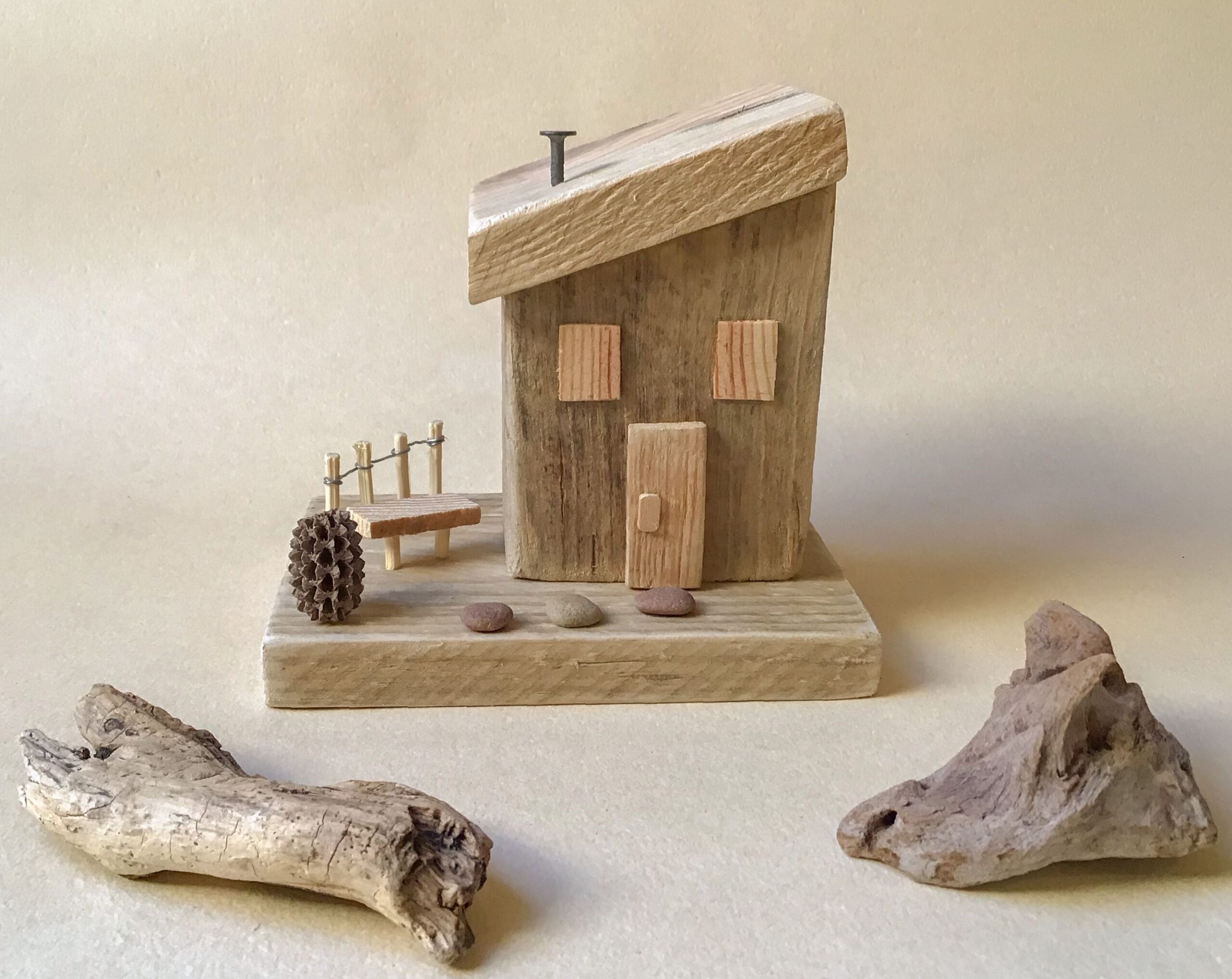 Cette maisonnette en bois et bois flotté prendra sa place dans une chambre, un bureau, un salon, une cuisine ou tout autre endroit de votre intérieur.