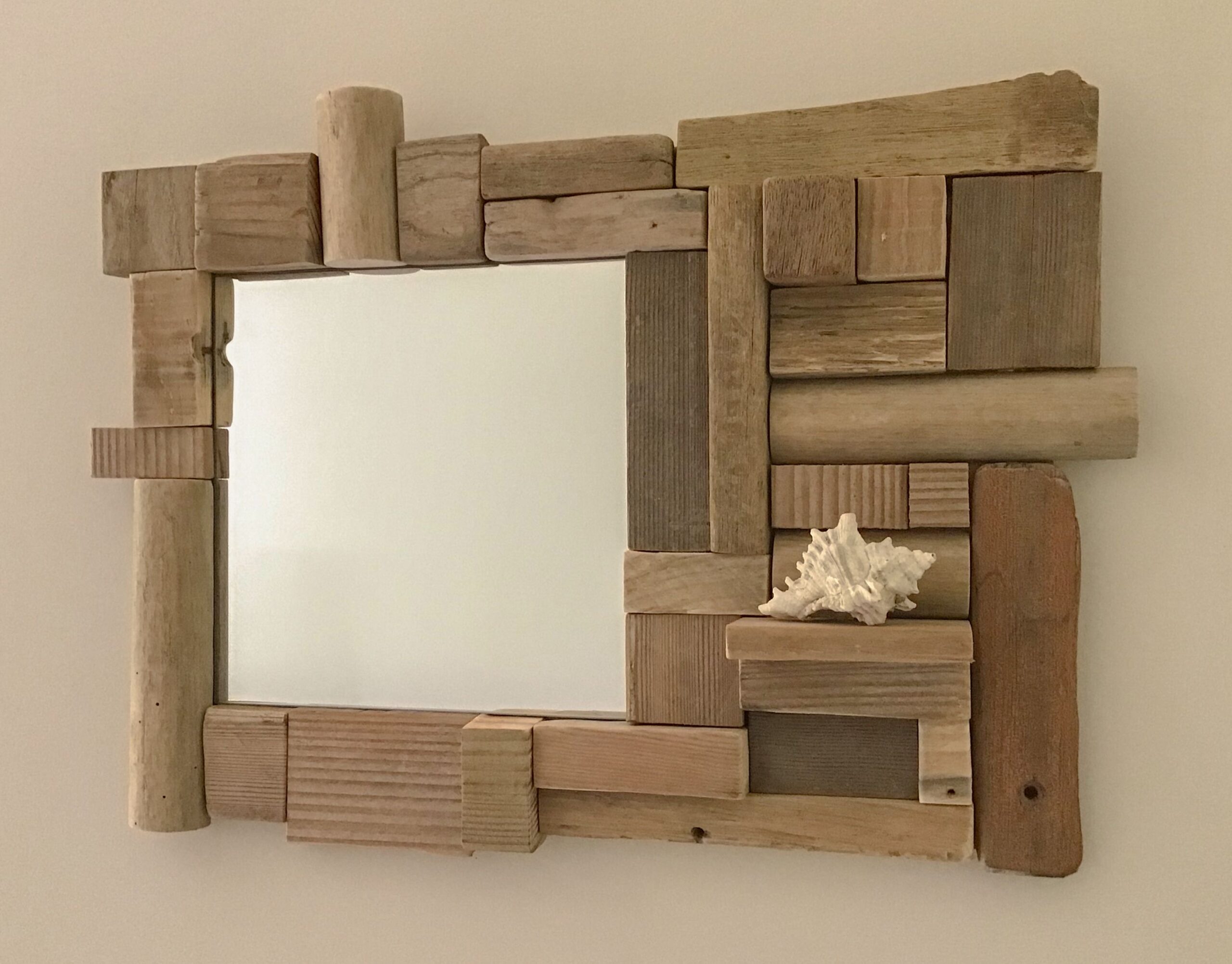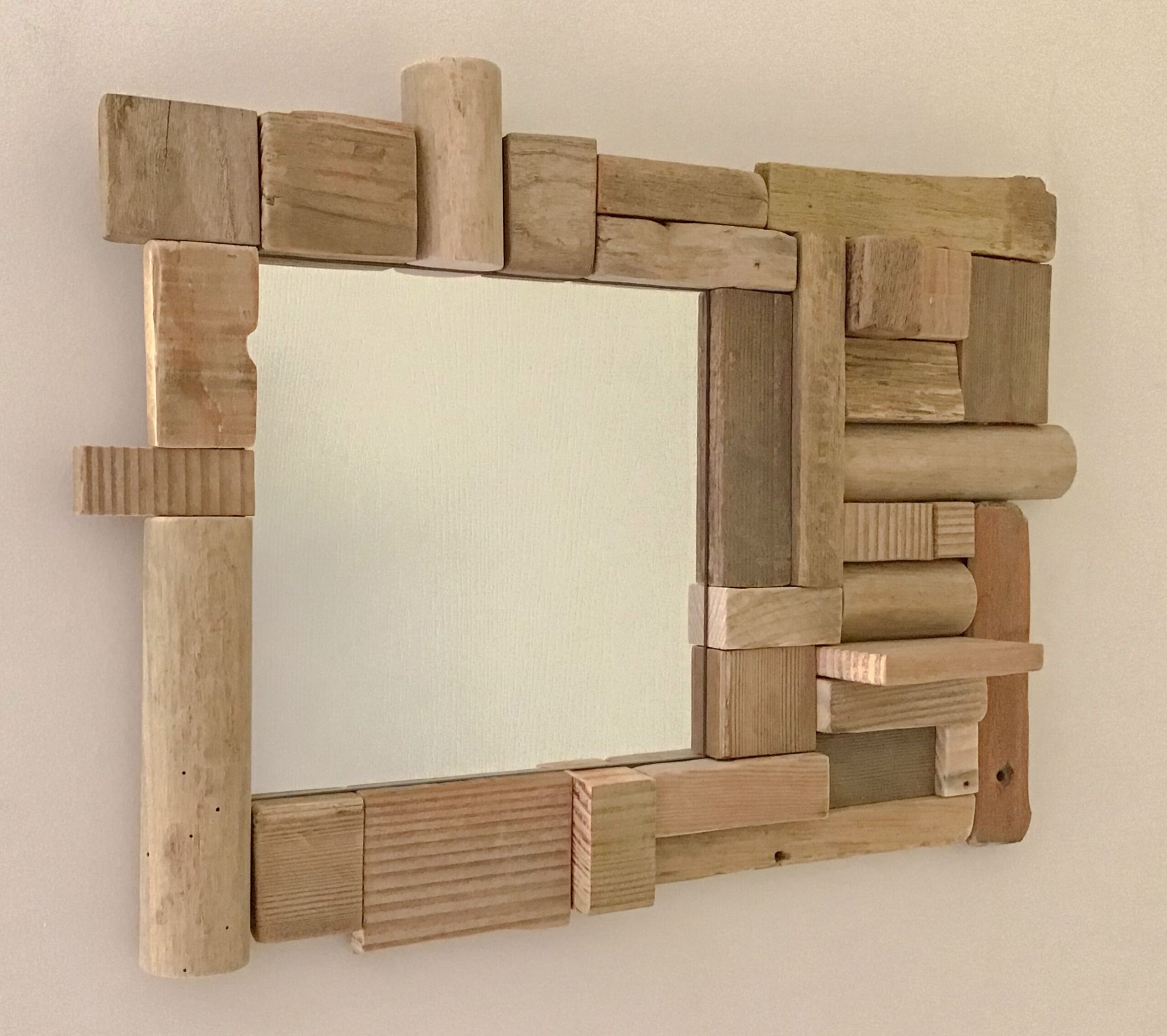 Ce miroir est une création originale pour tous les amoureux de la mer et de la nature. Fait de bois flotté, ce miroir a été fabriqué en assemblant plusieurs morceaux de bois flotté nettoyés, coupés et poncés, toujours dans un esprit écologique, marin et nature. Chaque bois est non seulement collé mais aussi vissé pour plus de solidité. Ces bois flottés sont des éléments qui ont été ramassés directement sur les plages de la Côte d’Émeraude, en Bretagne. Ce miroir vous rappellera le bord de plage et amènera un air rafraîchissant à votre décoration intérieure. Un des bois est fixé volontairement dans un autre sens pour pouvoir y poser une bougie, un coquillage ou autre.