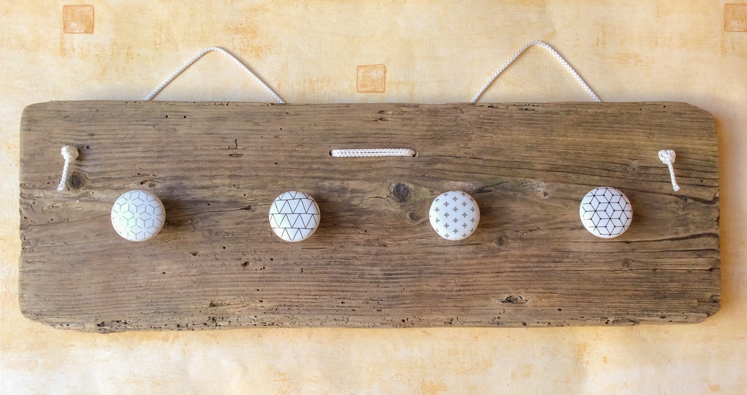 Patère en Bois flotté avec quatre boutons en céramique aux motifs différents pour pendre bijoux, foulards, vêtements ou autres …