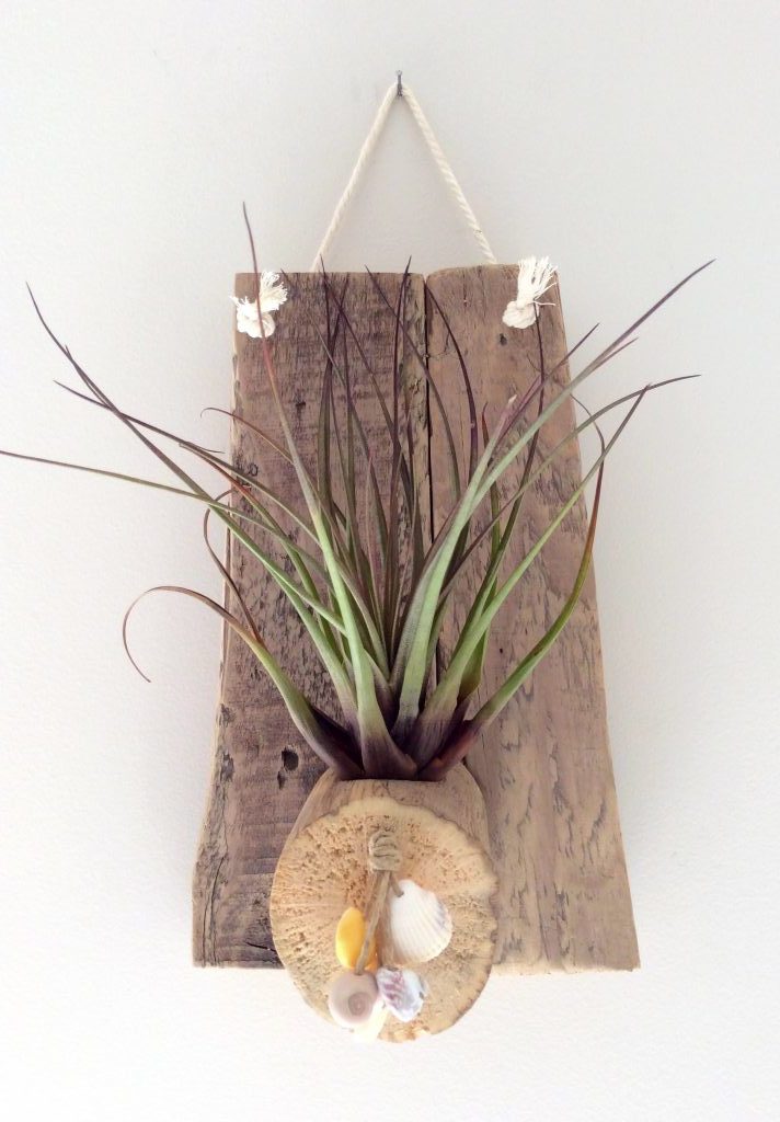 Objet décoratif en Bois flotté naturel à suspendre au mur agrémenté d’un Tillandsia et de Breloques en Coquillage.