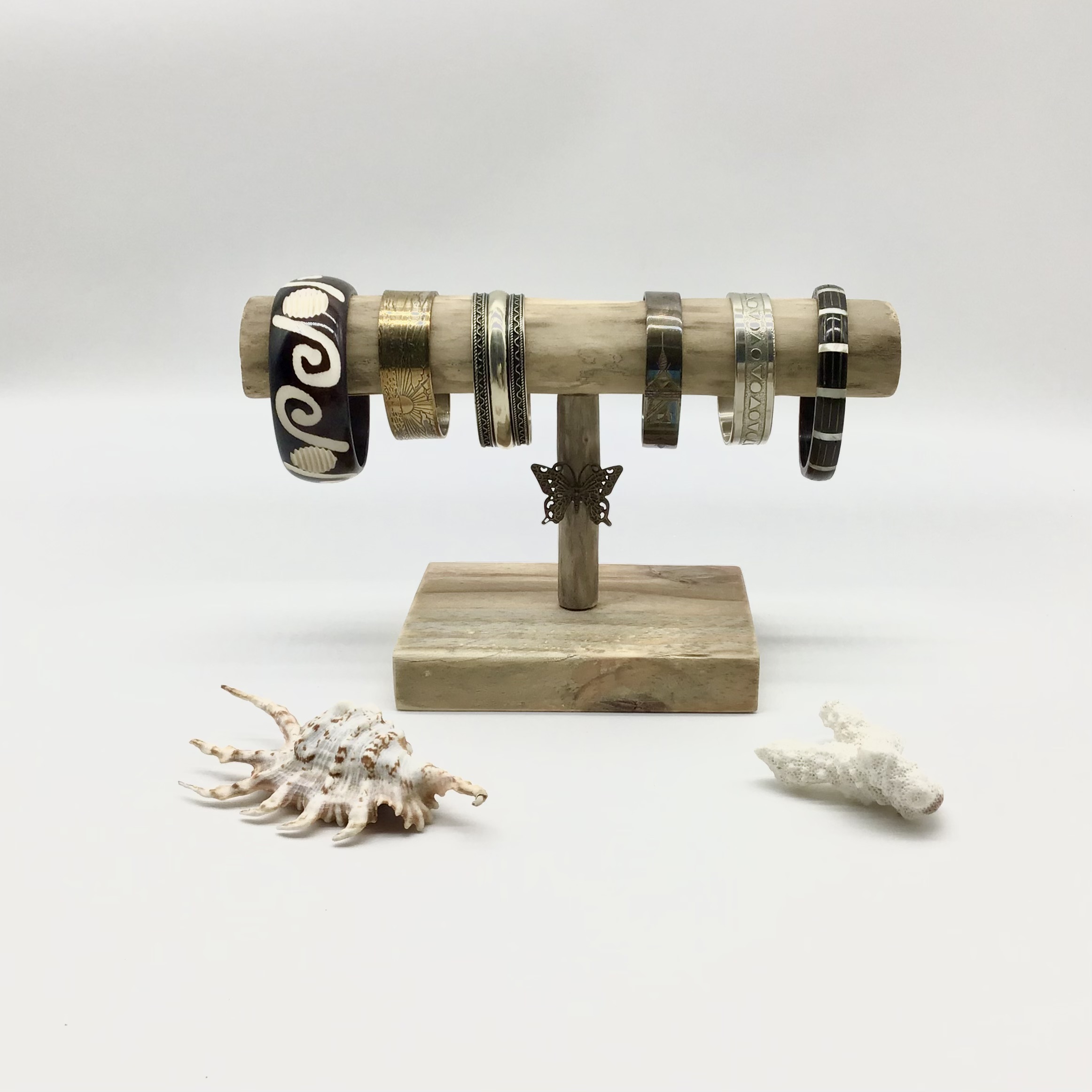 Ce porte bijoux en bois flotté est une création originale pour ranger vos bracelets et les mettre en évidence. C’est dans un esprit écologique et nature que ce porte bijoux décorera votre intérieur, dans une chambre ou une salle de bain. Ce porte bijoux est composé d’un gros bois flotté pour les bracelets fixé sur un socle en bois flotté également. Il est agrémenté d’un petit papillon en métal sur la tige. Le bois flotté a été ramassé sur les plages de la Côte d’Émeraude, en Bretagne, toujours dans un esprit écologique. Vous n’aurez plus à chercher vos bijoux au fond d’une boîte ou d’un tiroir. Ce porte bijoux est pratique et décoratif.