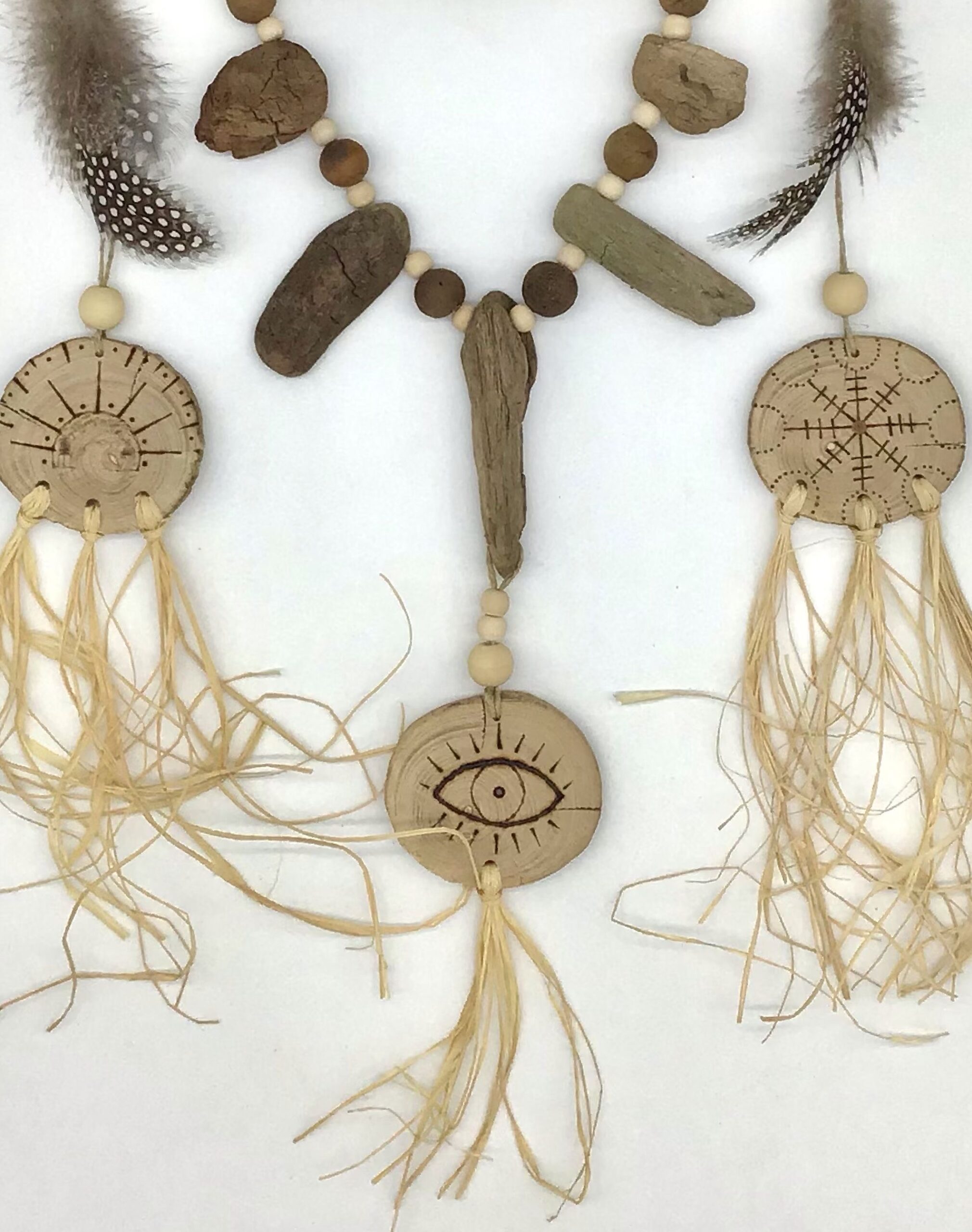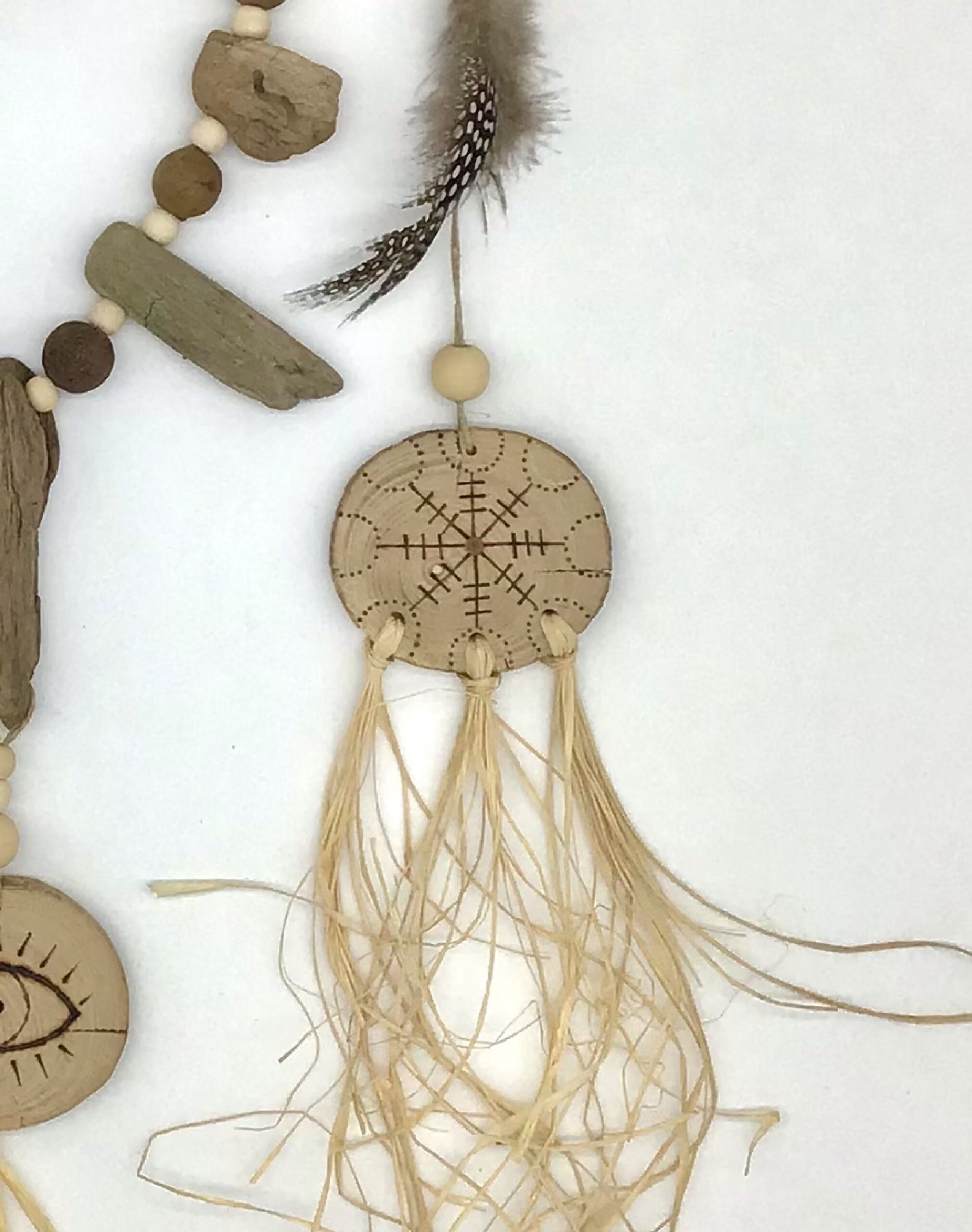 Suspension en bois flotté de style « Boho » composée de deux bois flottés où sont suspendus trois disques en bois gravés, des perles en bois, des billes végétales, du bois flotté et des plumes naturelles ainsi que du raphia. Les disques ont été confectionnés par mes soins. Ils représentent différents symboles gravés à l’aide d’un pyrograveur. Les disques de bois flotté ont été coupés et poncés par mes soins. Tous les éléments sont suspendus à l’aide de ficelle de lin.