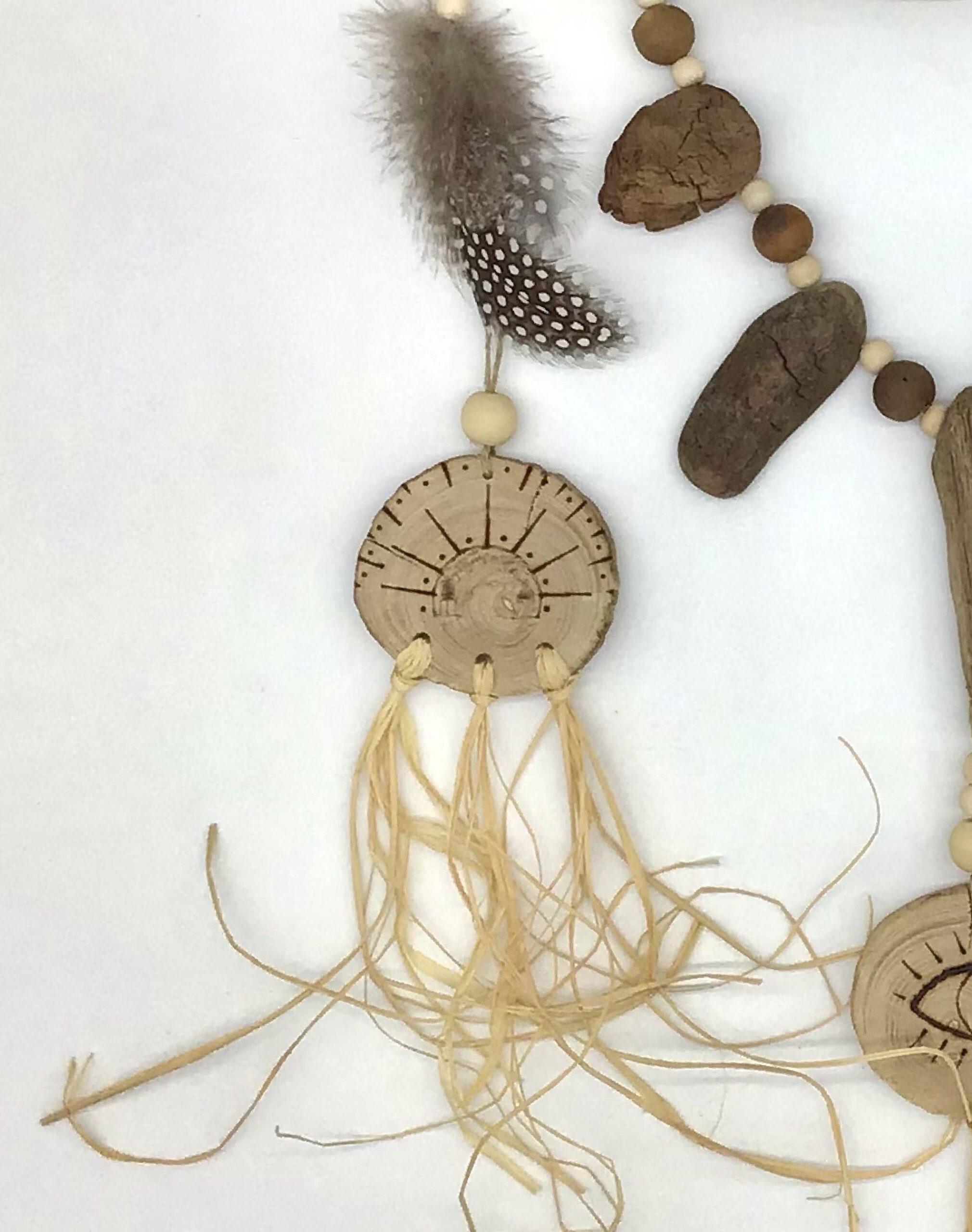 bois, Bois flotté, Dentelle, Perle, Plumes, raphia