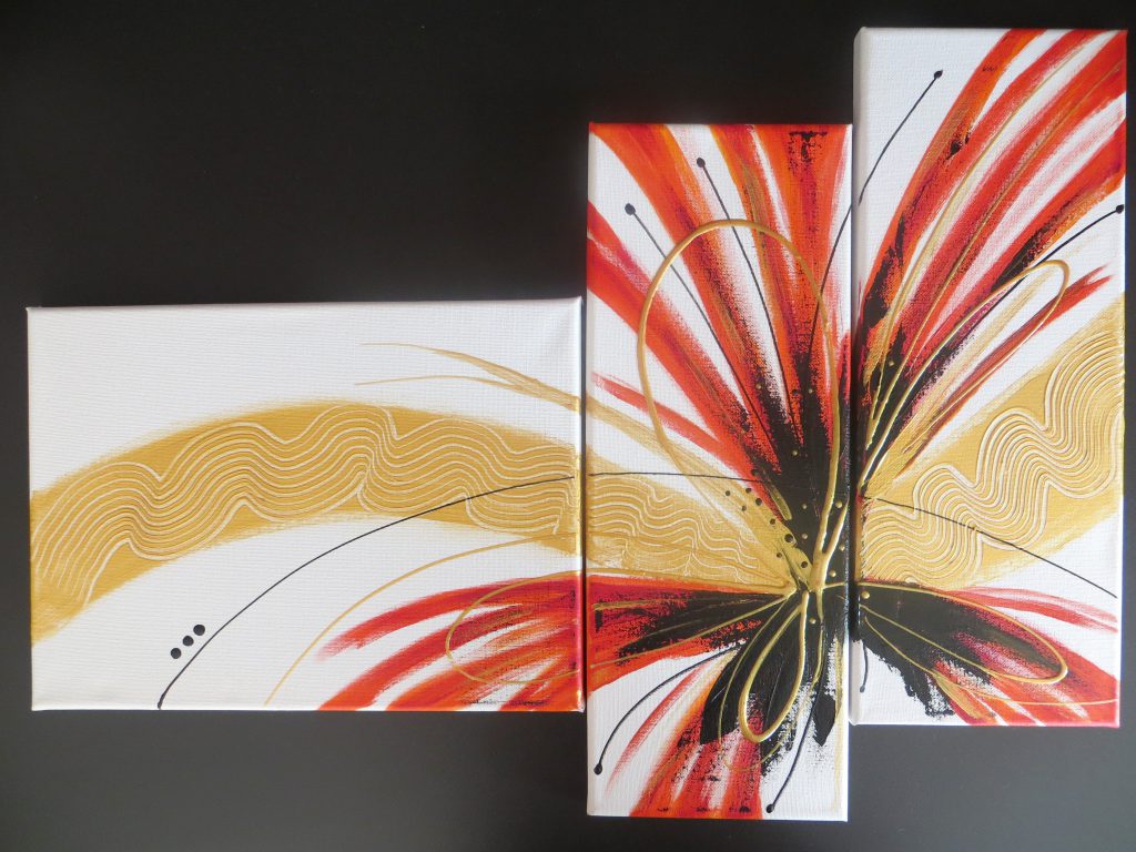 Tableau de style Abstrait dans les couleurs blanc, rouge et or, peint à l’acrylique. Tableau composé de trois Toiles côte à côte.
