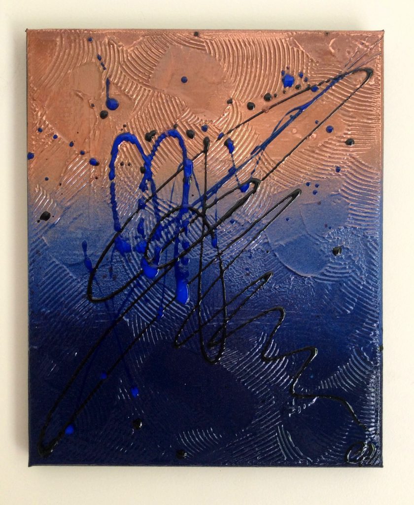 Tableau de style Abstrait dans les couleurs bleu et bronze avec des touches de noir, peint à l’acrylique avec une partie en relief.