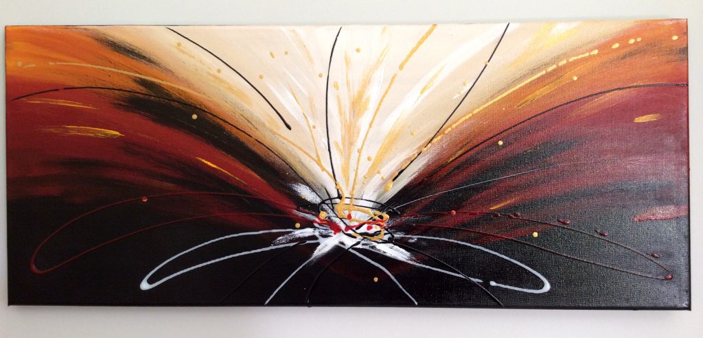 Tableau de style Abstrait dans les couleurs noir, rouge et Orange, avec des touches de beige et doré, peint à l’acrylique.