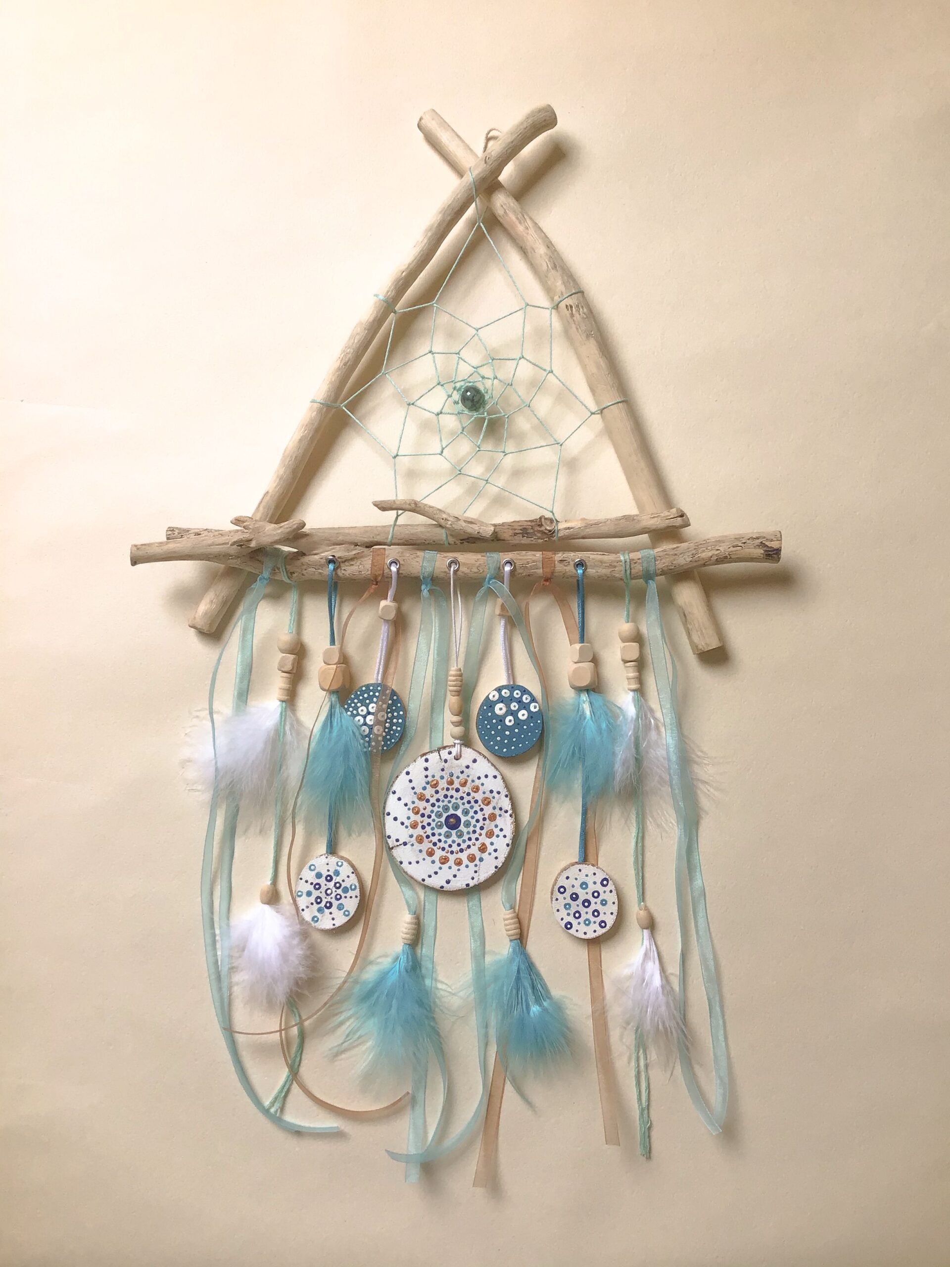 On le voit partout, utilisé de nos jours pour décorer les chambres, l’attrape-rêve est un objet artisanal d’origine ojibwé chez les Amérindiens pour empêcher les mauvais rêves. En général rond, composé d’un cerceau en saule, d’un réseau de fils en forme de filet, de plumes et de décorations diverses, je vous propose d’en fabriquer un triangulaire en bois flotté.