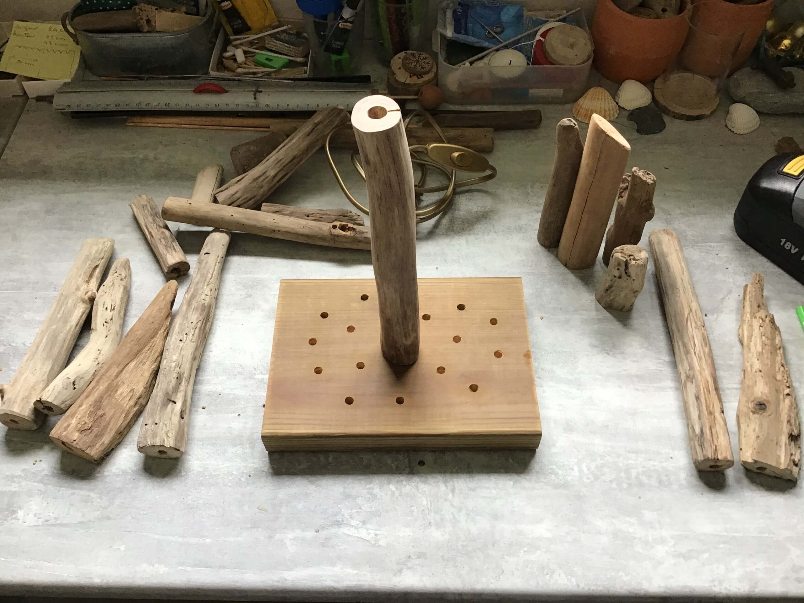 Ensuite, trouez le socle aux différents endroits choisis ainsi que chaque bois flotté pour y insérer les tourillons (mèche 6).